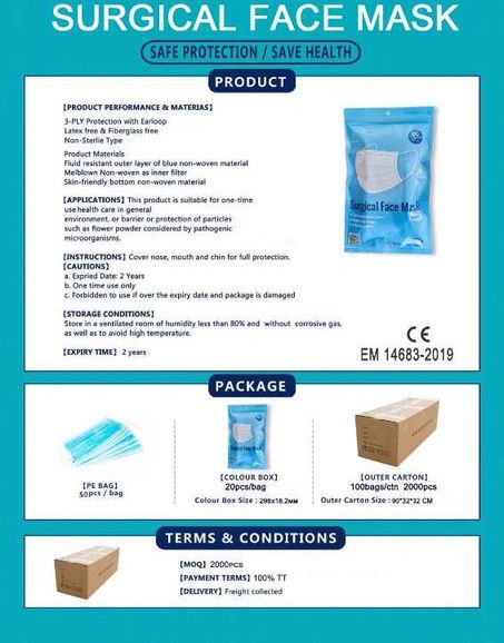 Nos masques jetables BX-001 sont vendus à la caisse. Ils sont empaquetés en emballage de 50 masques par sachet scellé. Il y a 50 sachets dans une boite d’expédition pour un total de 2500 masques BX-001 par boite. Les dimensions de la boite d’expédition sont de 91 x 34 x 34 cm. Le poids d’une caisse d’expédition est 8 kg. Le prix pour 2500 masques BX-001 est $3,125.00 plus taxes.